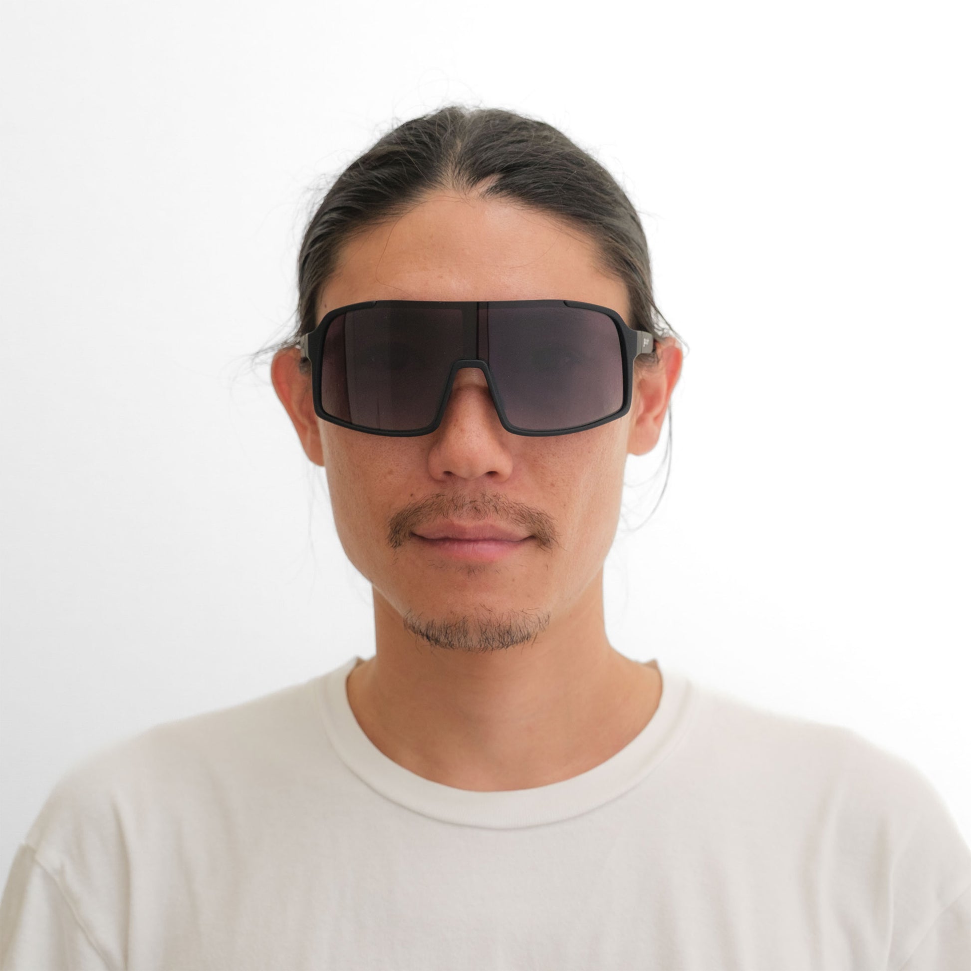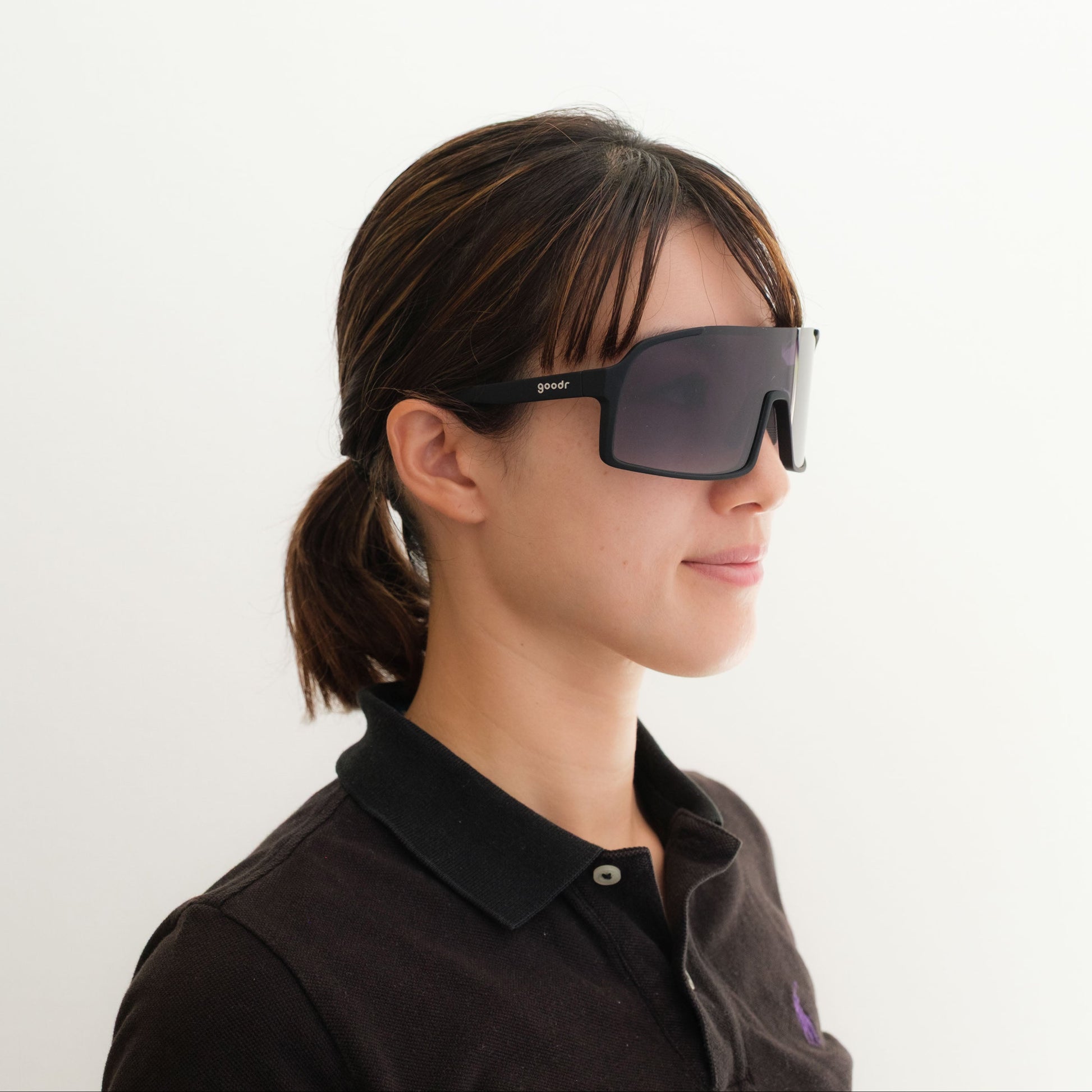 そんなハードコアなあなたにぴったりなのが、このブラックのシールドサングラス(ブラックグラデーションレンズ)。