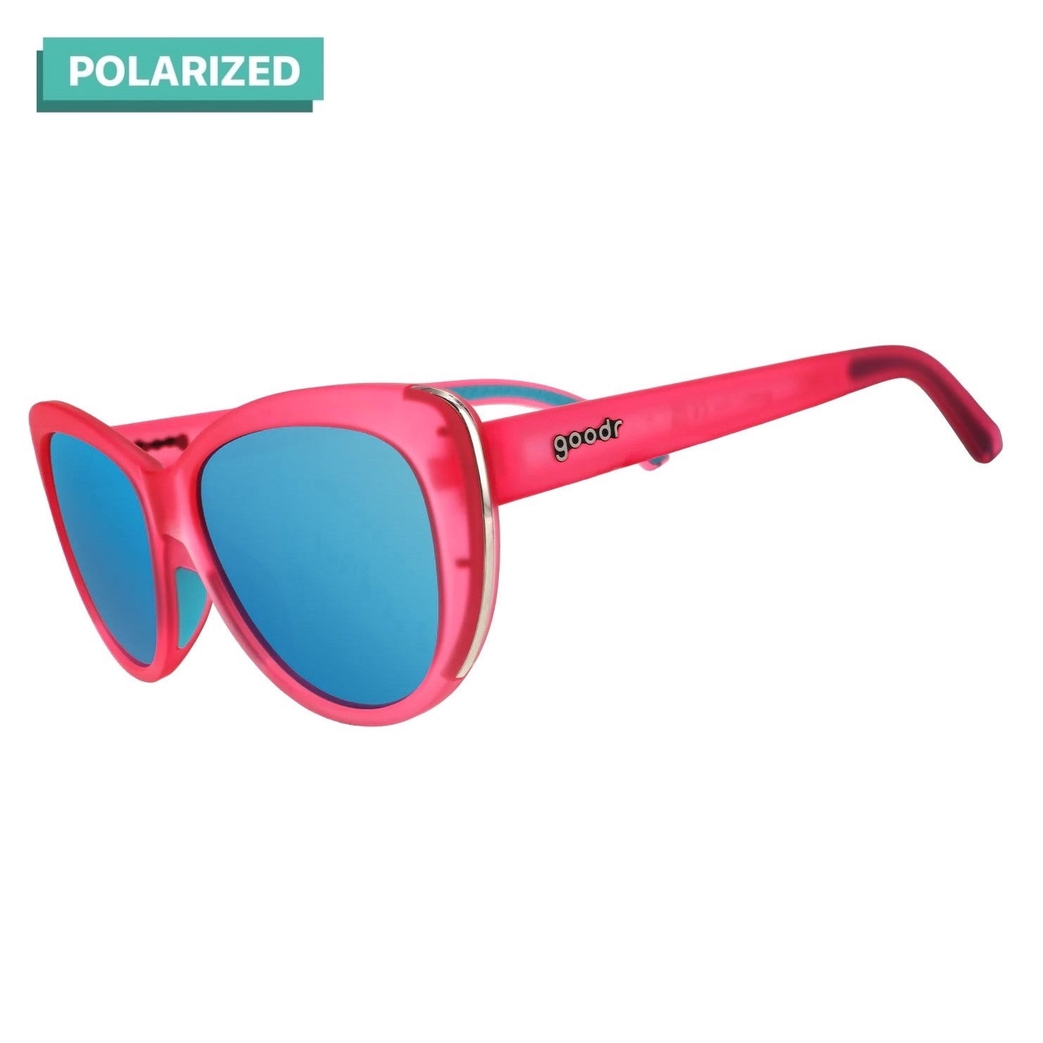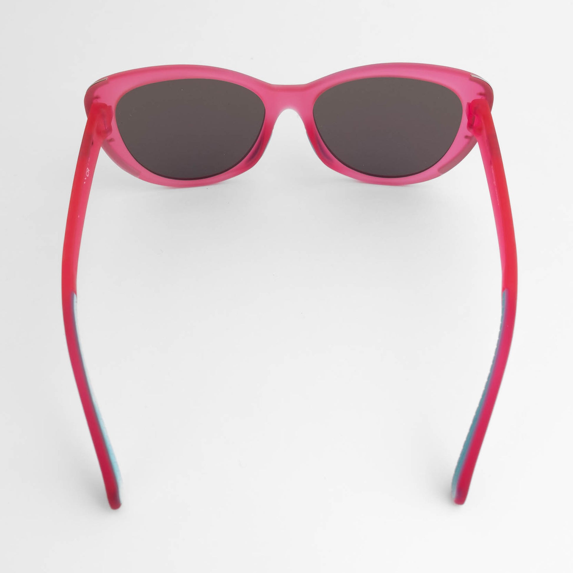 ジューシーな透け感ピンクのキャットアイフレームに、ティールのリフレクティブレンズとクロームのアクセントをプラス。