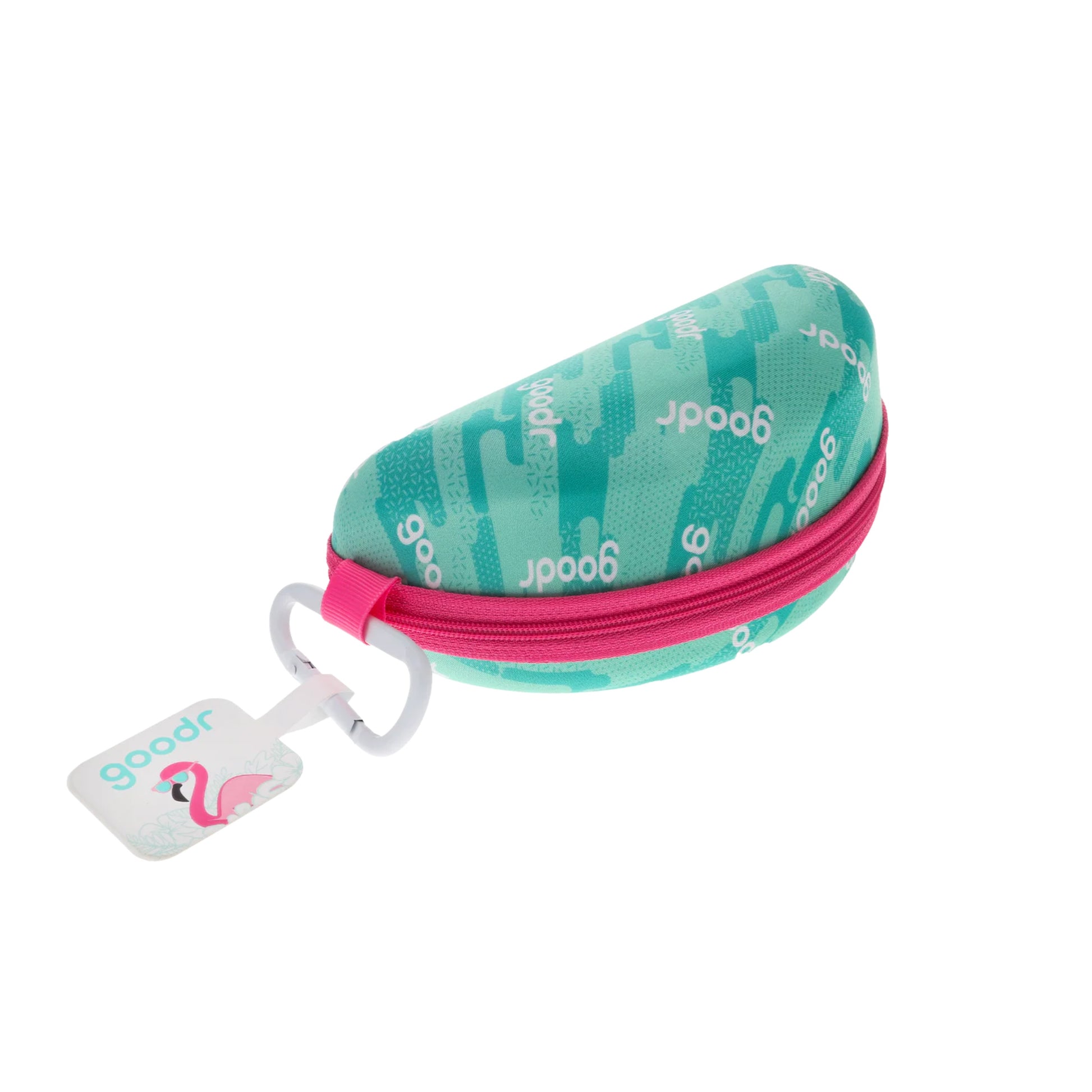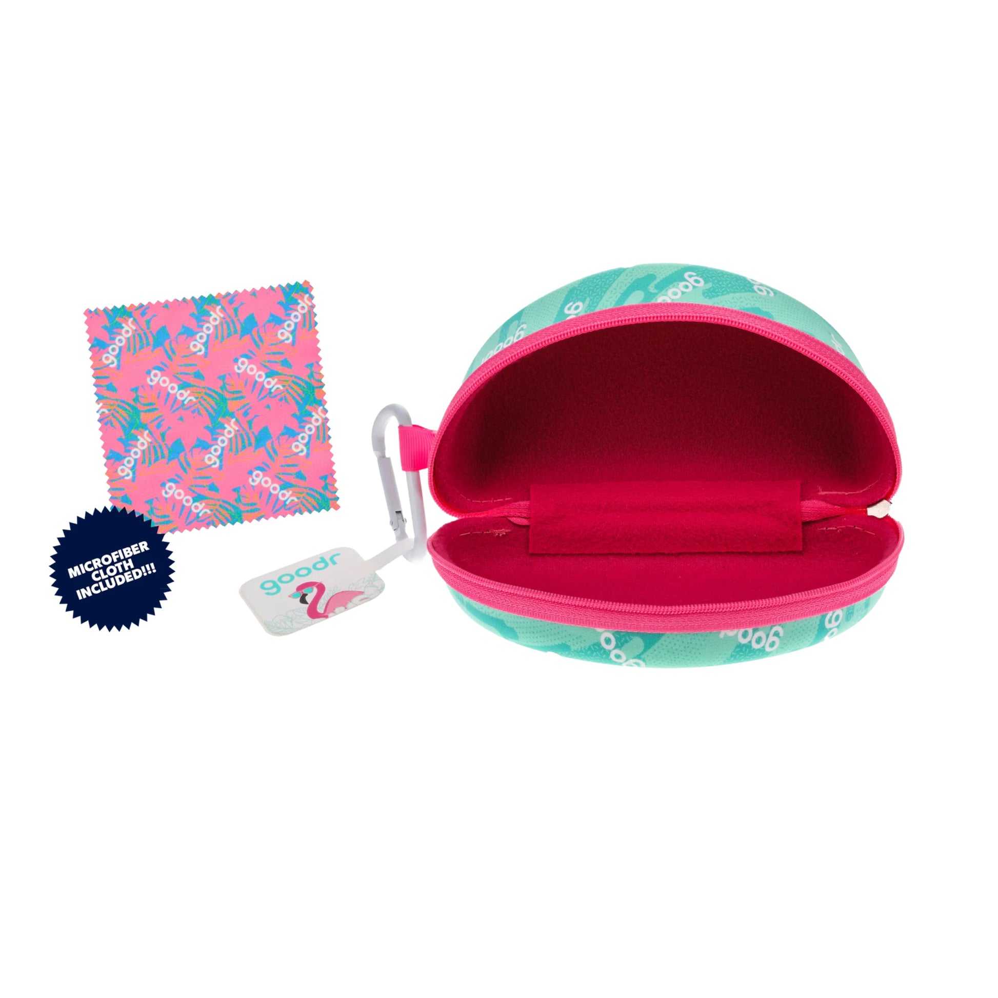 クッション性のある柔らかなライニングが付いたサングラスケース。ジッパー開閉式で、中身が暴れても傷つきにくく、外に飛び出す心配もありません。サングラスのケアに使えるマイクロファイバークロスと、引っ掛けられるgoodrタグとセットになったカラビナ付き。